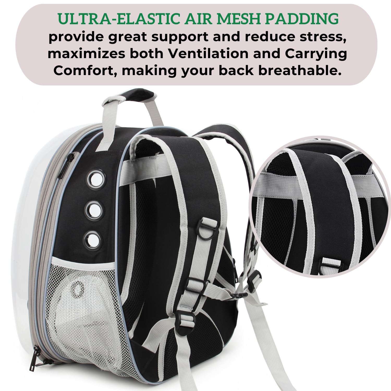 Safety Straps: Emphasize the built-in safety straps or harnesses that secure pets in place, preventing them from jumping out or falling.